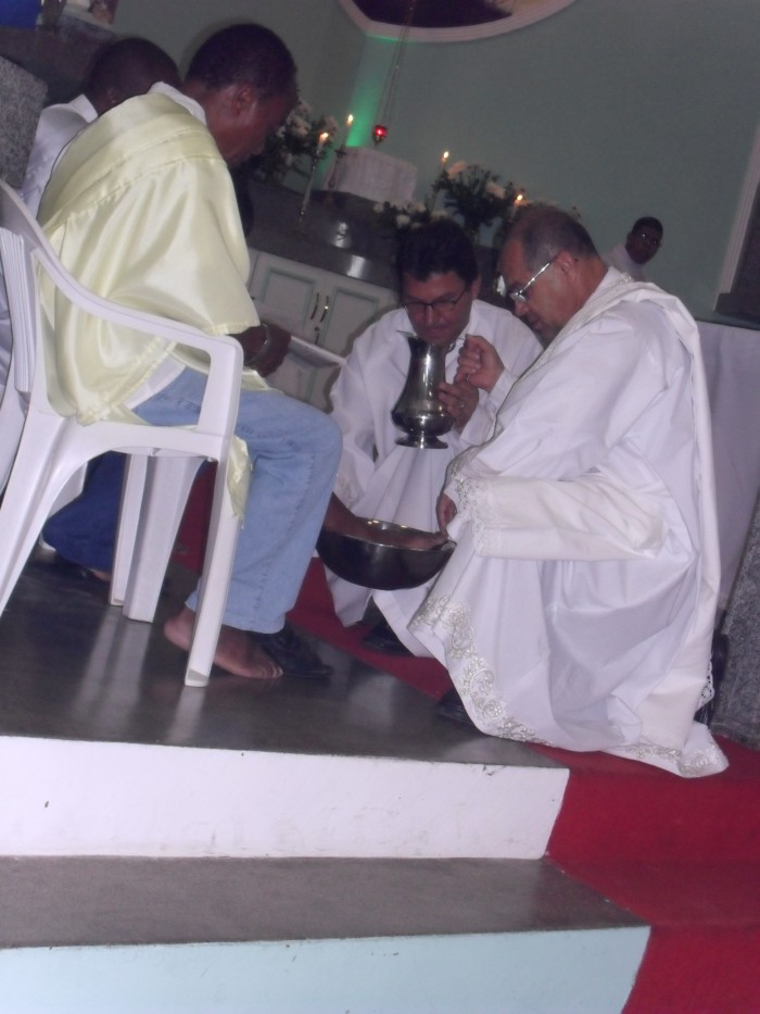 Lembrando o ato do lava-pés,os homens participantes do Grupo de Oração do Terço dos Homens(GOTHS) ,simbolizaram os apóstolos circundando o altar e tiveram os pés lavados pelo Padre.